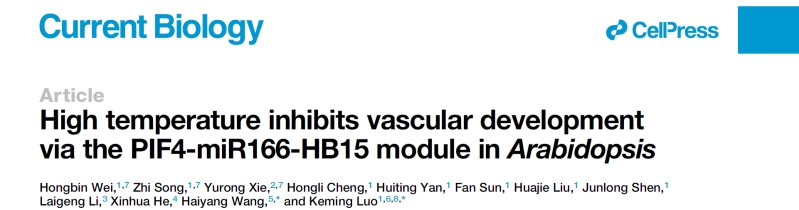 近期,西南大学bw必威西汉姆联官网罗克明团队联合华南农业大学王海洋团队在Cell旗下期刊Current Biology 发表了题为 “High temperature inhibits vascular development via the PIF4-miR166-HB15 module in Arabidopsis” 的研究论文。该研究揭示了高温抑制拟南芥花序茎中维管发育,导致植株细弱、易倒伏。温度信号关键因子Phytochrome-Interacting Factor 4 (PIF4)通过抑制MIR166表达以释放下游HD-ZIPIII转录因子HB15,进而抑制花序茎中的维管束数目和次生壁合成。该研究为植物在高温条件下茎秆倒伏的调控机制提供了新的见解。