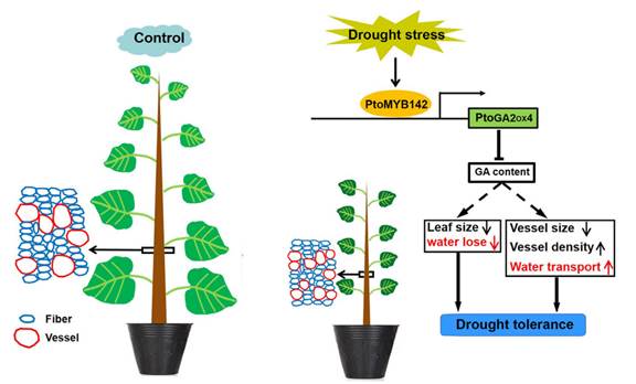 该研究发现,R2R3型MYB转录因子PtoMYB142在杨树叶片和发育中次生木质部被干旱诱导。过表达PtoMYB142显著抑制了叶片细胞膨胀,导致杨树叶面积减小,同时茎导管密度增加、导管的管腔面积减小,进而减少了杨树叶片水分的散失,并维持了干旱胁迫下的茎水势。转录组分析及含量测定实验等表明PtoMYB142通过调控赤霉素含量稳态响应干旱胁迫。