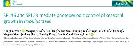 近日,西南大学bw必威西汉姆联官网罗克明教授团队在国际主流植物学期刊New Phytologist在线发表了题为“SPL16 and SPL23 mediate photoperiodic control of seasonal growth inPopulustrees”的研究论文,报道了短日照条件下PIF8-miR156-SPL16/23-FT2/BRC1级联通路介导调控杨树生长停止和进入休眠过程。该研究建立了光周期感知模块phyB-PIF8与树木物候调控新模块miR156-SPL16/23的直接联系,为树木季节性生长背后的分子机制提供了新的见解。