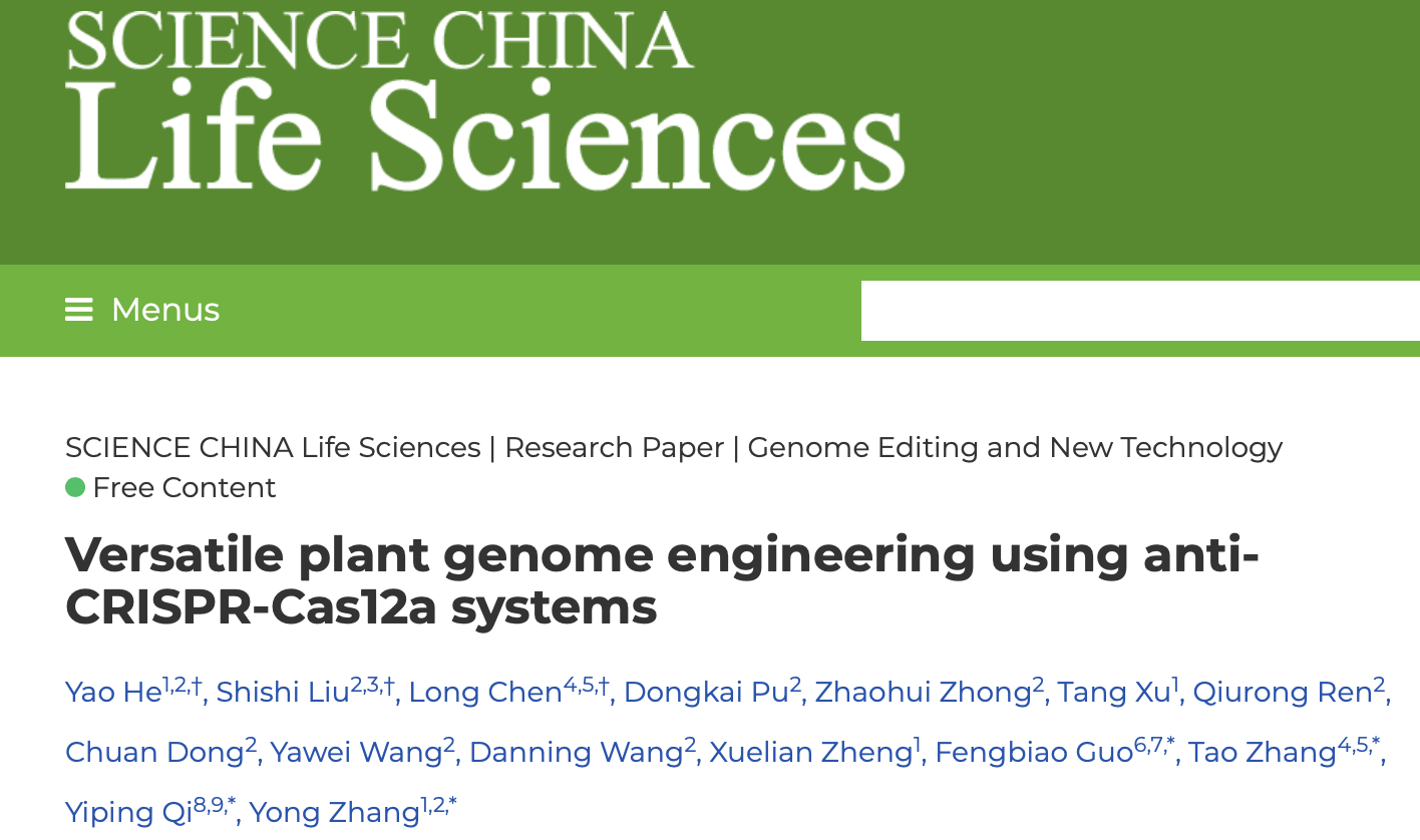 以CRISPR-Cas9、Cas12a为代表的基因组编辑系统在植物研究和作物改良中已被广泛应用,然而噬菌体、细菌中与之伴生的anti-CRISPR(Acr)蛋白在基因组编辑基础研究及应用实践中的潜力仍待明确界定。近日,SCIENCE CHINA Life Sciences杂志在线发表了由西南大学张勇课题组及其合作团队撰写的“Versatile plant genome engineering using anti-CRISPR-Cas12a systems”研究论文。该研究基于type V Acr蛋白与Cas12a核酸酶,设计了type V型Acr蛋白和Cas12a核酸酶共表达策略的植物基因组编辑新系统,分析Acr蛋白对Cas12a植物基因编辑活性和特异性的影响,实现了水稻内源基因高特异性有效编辑,并构建了植物基因组合成生物学基因表达调控逻辑回路,进一步丰富了植物基因组编辑工具库。全文主要研究结果如下: