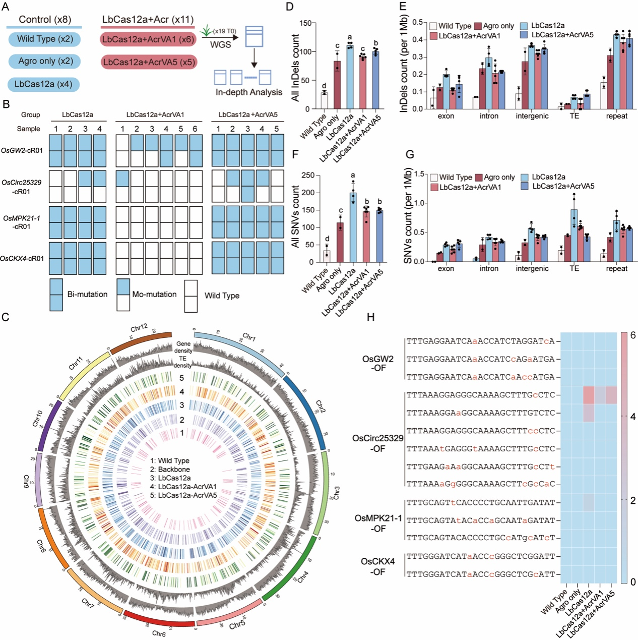 通过对19个T0代水稻植株进行全基因组测序(WGS),包括单独LbCas12a编辑的植株、LbCas12a+AcrVA1共编辑的植株、LbCas12a+AcrVA5共编辑的植株以及对照植株(图3A,3B)。测序结果表明,AcrVA1显著减少了LbCas12a的全基因组脱靶效应(图3C-3F),而AcrVA5则轻微减少了脱靶突变(图3C,3D,3F)。这些突变广泛分布于基因组的各个区域,尤其是在基因间和重复区域(图3E和3G)。通过Cas-OFFinder预测crRNA脱靶位点和WGS数据分析,证实了AcrVA1和AcrVA5能减轻LbCas12a在水稻中的脱靶效应(图3H)。