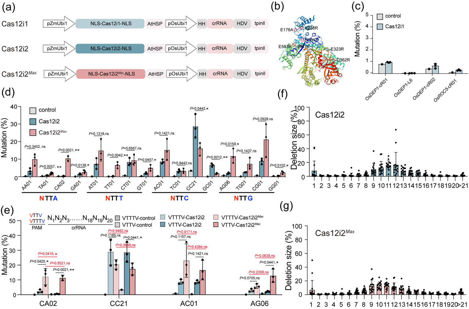 通过水稻原生质体系统评估不同Cas12i植物基因组编辑新系统的编辑活性(图1a和1b)。在水稻原生质体中,Cas12i1表现出有限的编辑活性(图1c),而Cas12i2和Cas12i2Max显示出更高的效率(图1d)。这些结果表明,Cas12i2系统在基因组编辑方面通常比Cas12i1更有效。为了进一步评估Cas12i2和Cas12i2Max在植物中的PAM需求,作者在水稻基因组中选择了16个具有NTTN PAM的内源位点。Cas12i2在水稻原生质体中编辑了16个靶位点中的13个,效率高达28.5%,而Cas12i2Max编辑了所有16个位点,效率高至20.9%,且Cas12i2和Cas12i2Max对具有VTTV和VTTTV PAM的相同间隔物具有相似的编辑效率(图1d和图e)。这些发现证实了Cas12i2Max系统对NTTN PAM的需求,并证明Cas12i2Max是水稻原生质体中比Cas12i2核酸酶更稳健的核酸酶变体。同时,与Cas12a、Cas12b、Cas12j2核酸酶类似,Cas12i2和Cas12i2Max主要引起的删除多于插入,且以多碱基删除为主(图1f和图g)。