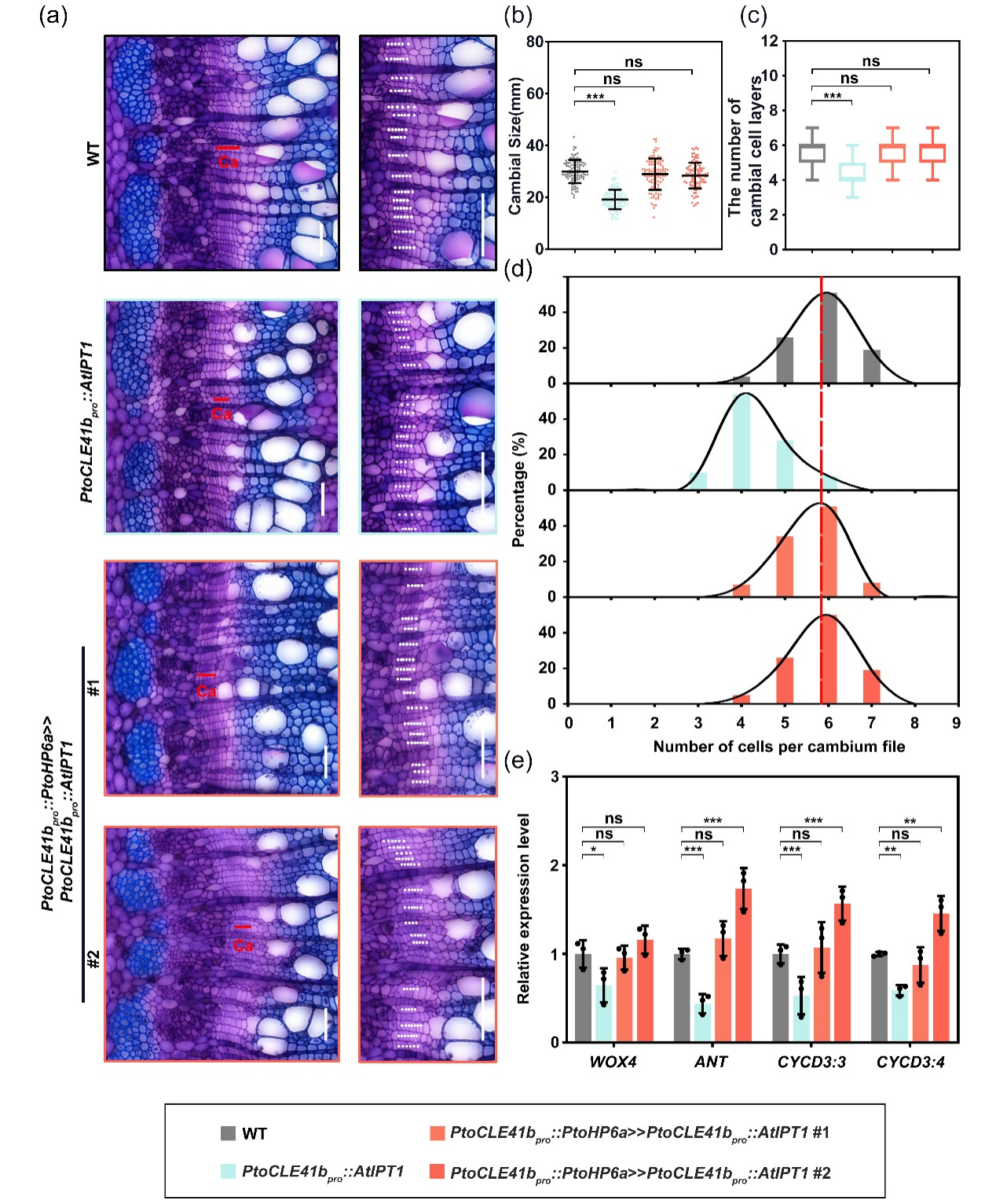 树木次生维管组织发育是木材形成的生物学基础。树木茎干中的维管形成层细胞经过分裂,向外侧分化为次生韧皮部,向内侧产生次生木质部,次生木质部细胞进一步经过次生壁沉积和细胞程序性死亡最终形成木材。作为木材产生的细胞来源,维管形成层细胞的增殖是决定木材产量的关键环节,其活性受到多种发育信号与环境因素的精细调控。细胞分裂素作为调控植物发育的关键内源激素,在树木茎干中主要富集于次生韧皮部区域,对维持维管形成层活性具有重要作用。细胞分裂素信号通路的关键抑制因子PtoHP6对于维持该信号的稳定性至关重要,然而其在木材发育过程中的具体功能尚不明确。