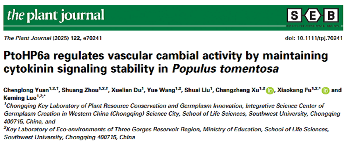 2025年5月30日,西南大学罗克明研究组在Plant Journal发表了题为“PtoHP6a regulates vascular cambial activity by maintaining cytokinin signaling stability inPopulus tomentosa”的研究论文。该研究揭示了在木材发育过程中PtoHP6基因对于维持次生韧皮部细胞分裂素信号稳定及正常维管形成层活性具有重要的生物学意义。