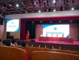 接下来是生科院研究生团总支研究生会的招新宣传,研究生会主席桂振威为新生们依次介绍了研究生会的六个部门的职能和特色,鼓励同学们加入研会施展才华。现场同学们积极提问,高年级同学热心解答学习或者是生活上的问题。