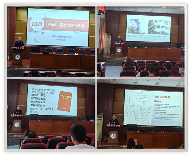 为进一步强化学院师生消防安全意识,提高师生自防自救能力,我院于7月5日组织开展消防安全主题教育活动。此次活动特别邀请到重庆市北碚区消防救援局专业技术十级工程师巫林、所辖城北消防救援站政治指导员曹怀锋等消防指战员对我院师生进行消防安全培训。