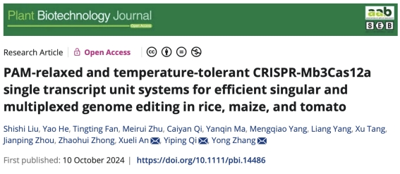 CRISPR-Cas12a是Type V-A型CRISPR-Cas核酸酶成员,目前已被应用于植物基因组编辑中。其中LbCas12a在多基因敲除编辑、非编码RNA编辑、启动子调控区编辑等研究中显示了明显优势,为植物功能基因解析及分子育种提供了有效工具。但LbCas12a存在需要识别“5-TTTV-3”的4碱基PAM基序,室温活性相对较低等问题,限制了其在重要农作物中的应用范围。同时,相较自然界中广泛存在的Type V-A型CRISPR-Cas12a分子资源,目前可以有效作为植物基因组编辑工具的Cas12a同系物仍然鉴定、开发有限。近日,Plant Biotechnology Journal在线发表了由西南大学/电子科技大学张勇教授及其合作团队撰写的“PAM‐relaxed and temperature‐tolerant CRISPR‐Mb3Cas12a single transcript unit systems for efficient singular and multiplexed genome editing in rice, maize, and tomato”研究论文。