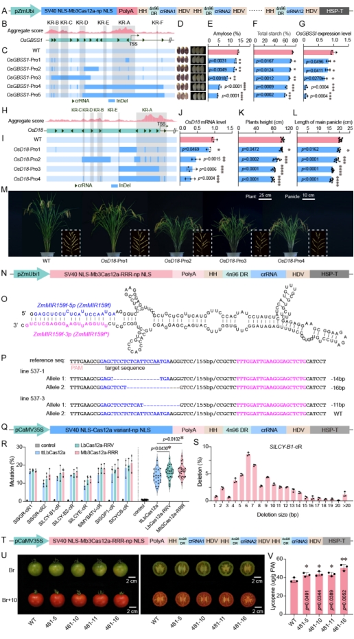 为了验证Mb3Cas12a STUHDH系统的广泛适用性,研究者在水稻、玉米及番茄中进行了应用实践。针对水稻株型、品质重要农艺性状基因OsD18和OsGBSS1的启动子进行精确调控编辑,成功获得了OsGBSS1表达水平及籽粒中直链淀粉含量有效降低(图3A-3G),以及OsD18表达水平降低、植株半矮化、减小及分蘖数量增加的水稻材料(图3H-3M)。基于低温耐受的Mb3Cas12a-RRR核酸酶系统,创制了祥249(X249)玉米自交系的ZmMIR159f稳定编辑材料,实现了基于Mb3Cas12a的玉米基因组非编码RNA基因的有效敲除(图3N-3P)。在番茄中开发了基于Mb3Cas12a-RRR核酸酶变体的基因组编辑工具,实现了8个番茄内源靶向位点的高效共编辑。并对番茄红素合成相关基因SlMYBATV、SlGGP1和SlCYCB进行多基因共编辑,成功地在番茄共编辑植株果实中检测到番茄红素含量的显著增加(图3Q-3V)。以上结果表明,Mb3Cas12a STUHDH及其变体系统能有效的实现蛋白编码基因敲除编辑、启动子调控序列编辑、microRNA功能性敲除编辑,丰富了植物基因组编辑工具箱。