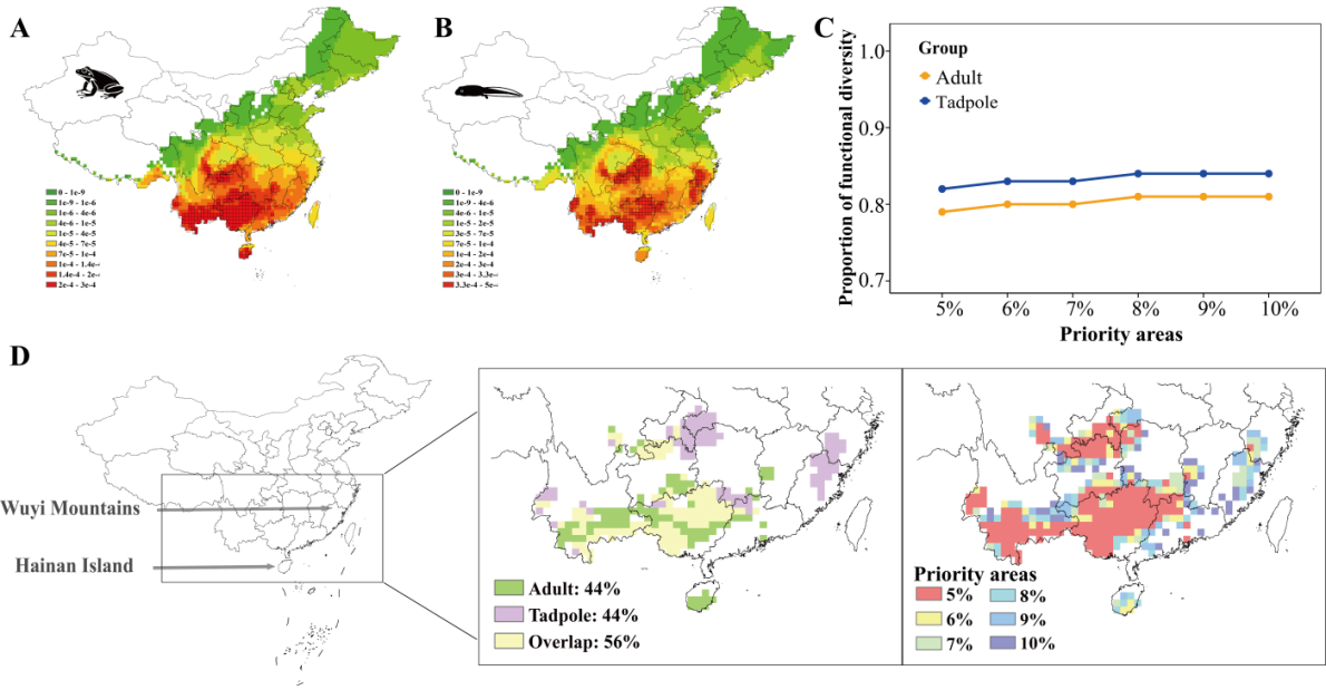研究团队通过长期广泛的野外考察,收集整理了557种中国无尾两栖动物成体和蝌蚪的功能性状信息,界定了功能多样性热点区域,并基于物种性状的独特性界定了保护优先物种。研究结果表明,中国557种无尾两栖动物成体和蝌蚪的功能多样性热点区域存在很大差异。成体功能多样性最高的区域位于中国西南部和南部的山区。对蝌蚪而言,除了西南地区以外,东南部山地(如武夷山脉)也拥有很多高的功能多样性。两个生活史阶段的功能多样性热点区域仅56%区域重叠。在保护优先物种方面,前5%的成体与蝌蚪优先物种中,仅18.8%的物种重合。成体优先物种中蛙科与角蟾科各占32%,而蝌蚪优先物种中角蟾科占比最高(58%)。基于成体功能性状确定的优先保护物种,仅能覆盖蝌蚪功能多样性的9.1%,而基于蝌蚪功能性状的优先物种也只覆盖了成体功能多样性的8.4%。这些结果表明,从优先保护区域和优先保护物种两个角度,基于单一生命阶段制定的保护策略都无法有效的保护其它阶段的功能多样性。